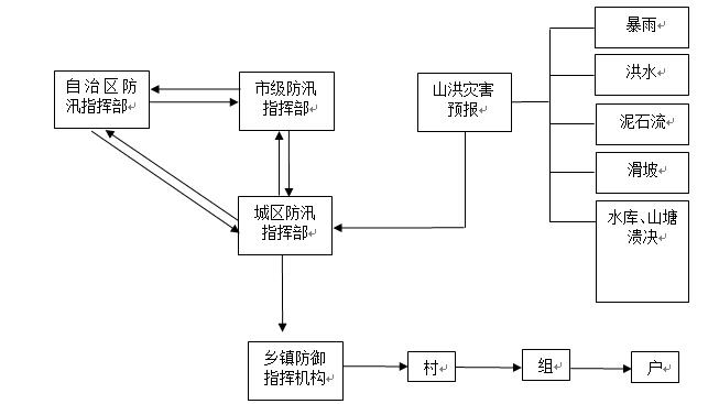 城区山洪灾害防御工作由城区山洪灾害防御指挥部统一领导和组织,各单位各司其责,实施山洪灾害防御预案。城区防汛抗旱指挥部办公室负责山洪灾害防御工作指挥部的日常工作。各镇政府、街道办山洪灾害防御指挥机构在城区指挥部的统一领导下开展山洪灾害防御抢险工作,具体组织本辖区的山洪灾害防御抢险工作,发现异常情况及时向有关部门汇报,并采取相应的应急处理措施等。村级山洪灾害防御抢险工作组负责本行政村内降雨监测、预警、人员转移和抢险等工作。