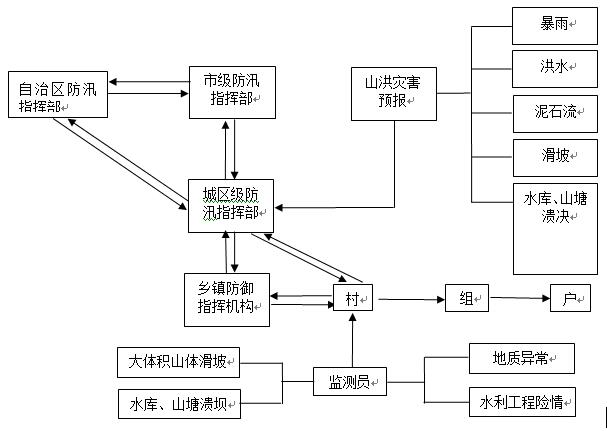 山洪灾害重点防御区域的镇和村坡要成立本辖区的山洪灾害防御指挥机构,领导和组织本辖区的山洪灾害防御工作。各山洪灾害防御指挥机构应下设监测、信息、转移、调度、保障5个工作组和1~2个应急抢险队(每队不少于10人),各行政村成立以村主任、村支书为负责人的山洪灾害防御工作组。同时,各村成立以若干民兵为主体的应急抢险队,每个村、组都要落实降雨和水位、工程险情、泥石流、滑坡监测人员,确定一名信号发送员,并制花名册报送镇政府和街道办事处备查。