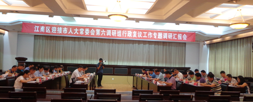 7月6日上午,市人大常委会第六调研组一行20余人在人大副主任阮兆丰同志的带队下到江南区开展行政复议工作专题调研。市人大常委会法工委副主任樊胜坚、市法制办副主任黄志斌全程陪同。城区人大副主任陈仲秋、常务副区长余洪、城区相关部门及西乡塘法院领导等参加了调研汇报会。
