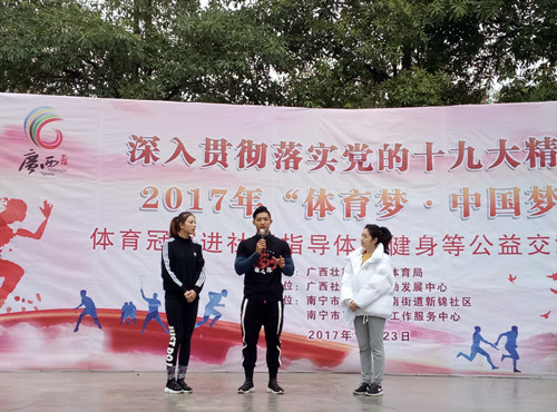 由广西体育局主办、广西社会体育运动发展中心承办、南宁市江南区江南街道新锦社区、南宁市彩虹社会工作服务中心协办的2017年“体育梦·中国梦”——体育冠军进社区公益交流活动,于12月23日上午在新锦社区同心文化广场顺利举行。