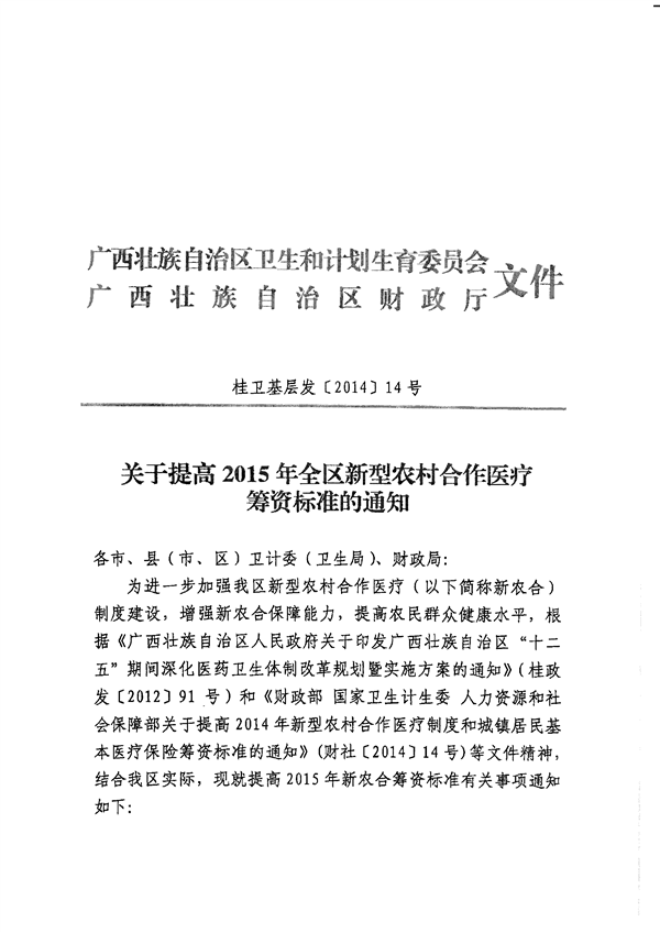 关于提高2015年全区新型农村合作医疗筹资标准的通知