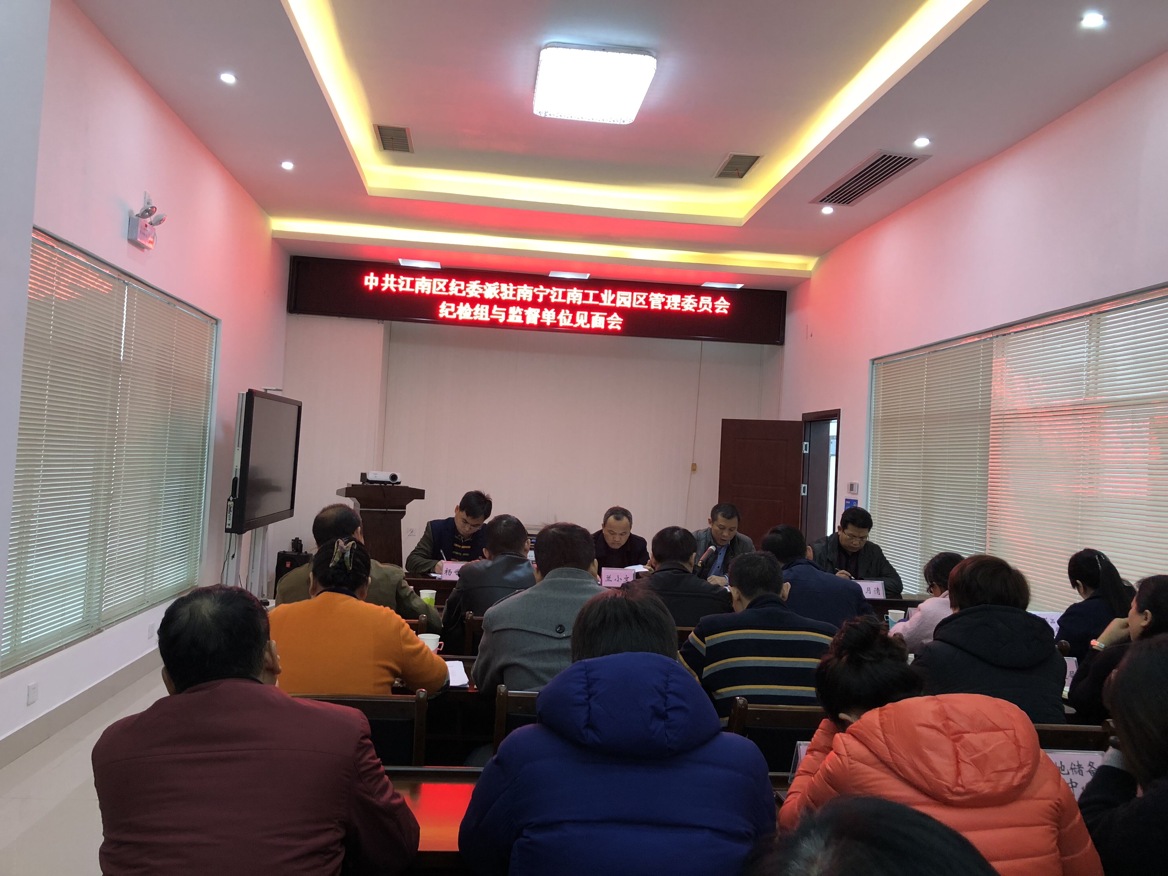 江南区纪委派驻南宁江南工业园区管理委员会纪检组全体人员与城区司法局、环境保护局、住房和城乡建设局、城市管理局、农业林业水利局、食品药品监督管理局、工商质监局、安全生产监督管理局、机关事务管理局、房屋征收补偿和征地拆迁办公室、招商促进局、工业园区管委会、水库移民工作管理局、公共资源交易综合服务中心、土地储备分中心等15个部门(单位)主要领导以及南宁江南工业园区管委会科级以上干部参加了见面会。