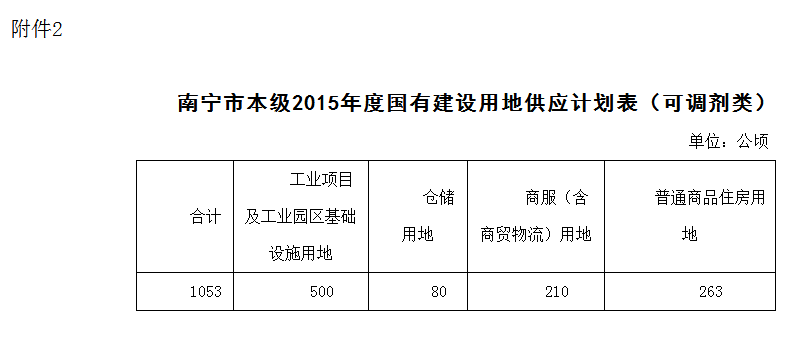 一、计划的目的、意义和编制依据 为科学调控土地市场,合理配置土地资源,积极发挥计划引导作用,切实加强国有建设用地供应管理。依据国土资源部《国有建设用地供应计划编制规范(试行)》,结合《南宁市城市总体规划》《南宁市土地利用总体规划》和土地利用年度计划,参考上年度供地情况和本年度用地需求,制定本计划。 二、指导思想和基本原则 适应新常态,落实新要求,严格执行国家节约集约用地制度和土地供应政策规定。坚持规模引导、布局优化、标准控制、市场配置、盘活利用,指导性与指令性相结合的原则,合理保障民生用地需求和调配各类用地供应,为提高南宁首位度做好用地保障,促进我市经济社会平稳健康可持续发展。 三、计划指标总量和结构 2015年度,市本级国有建设用计划供应总量为1950公顷,其中必须保障类用地计划供应897公顷,可调剂类用地计划供应1053公顷。具体如下: (一)必须保障供应的用地主要是保障性安居工程用地和重大基础设施用地,计划供应897公顷。其中:保障性安居工程用地37公顷、公共管理与公共服务用地200公顷、交通运输(不含工业园区内的道路)用地610公顷、水域及水利设施用地30公顷、特殊用地20公顷。 (二)可调剂的国有建设用地计划供应1053公顷。其中:工业项目及工业园区基础设施用地500公顷、仓储用地80公顷、商服(含商贸物流)用地210公顷、普通商品住房用地263公顷。 四、住房用地供应计划 2015年度南宁市本级住房用地计划供应300公顷。其中:保障性安居工程用地37公顷(其中:各类棚户区改造用地25公顷、公共租赁房用地2公顷、预留限价商品房用地10公顷),普通商品住房用地263公顷。 五、政策导向 (一)优化供地结构和布局 在总量控制的前提下,优化产业空间布局,促进新兴产业规模化,鼓励同类产业向开发区集聚,整合开发区和工业集中区土地资源,切实提高土地利用效率,实现土地集约、产业集中、发展集聚,促进经济社会转型发展。重点保障列入自治区层面重大项目建设用地,优先保障市级层面的重点产业、城镇化建设、基础设施、生态环保、民生保障等重大项目建设用地。 (二)促进土地节约集约利用 坚持科学发展观和节约集约用地政策,鼓励盘活利用建设用地,建立城镇低效用地再开发、废弃地再利用激励机制;工业用地项目提倡和推进标准厂房建设,对适合多层标准厂房生产的中小微企业建设项目,鼓励和引导其进入标准厂房。 (三)发挥市场配置资源基础性作用 优化土地资源要素配置,深化土地使用制度改革,实行经营性用地、工业用地招拍挂出让制度,进一步扩大土地使用权公开出让的范围,发挥价格机制在土地资源配置中的作用,突出经济发展支撑项目用地服务。 六、计划实施保障 (一)积极强化措施,确保供地服务效率质量。计划实施中,市属相关部门要把握全面,突出重点,强化服务,保障供应,对年度重点大项目用地、政策性住房用地要采取超前介入,跟踪服务,全程保障,切实满足项目建设用地需求。 (二)加强协调配合,保证计划指标有效落实。市发改委、市工信委、市城乡建委、市规划局、市住房局、市国土资源局等相关部门要密切协调配合,共同组织做好建设项目用地各项工作。 (三)各城区、开发区要充分发挥职能作用,结合项目轻、重、缓、急和土地指标情况,探索土地征收可操作性预评估制度,加快完成征地拆迁任务,为供地计划的实施做好服务工作。 附件:1. 南宁市本级2015年度国有建设用地供应计划表(必须保障类) 2. 南宁市本级2015年度国有建设用地供应计划表(可调剂类) 3. 南宁市本级2015年度住房用地供应计划表