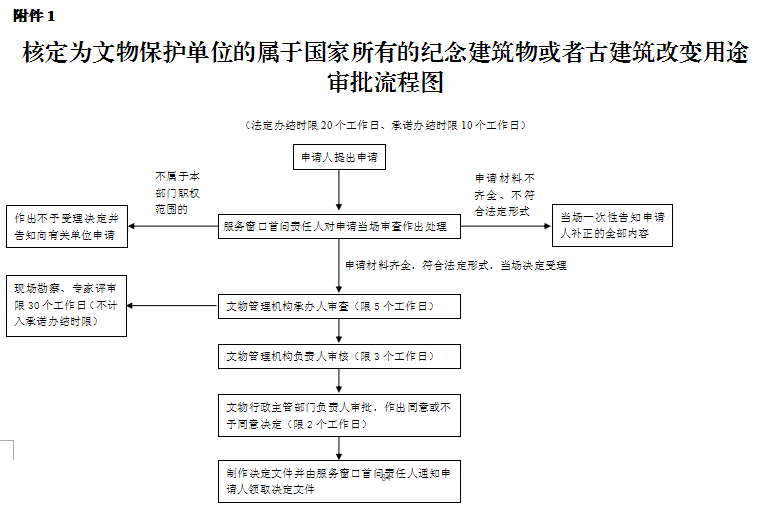 《中华人民共和国文物保护法》(1982年11月19日第五届全国人民代表大会常务委员会令第11号公布,2015年4月24日中华人民共和国主席令第28号予以修改)第二十三条 核定为文物保护单位的属于国家所有的纪念建筑物或者古建筑,除可以建立博物馆、保管所或者辟为参观游览场所外,作其他用途的,市、县级文物保护单位应当经核定公布该文物保护单位的人民政府文物行政部门征得上一级文物行政部门同意后,报核定公布该文物保护单位的人民政府批准;省级文物保护单位应当经核定公布该文物保护单位的省级人民政府的文物行政部门审核同意后,报该省级人民政府批准;全国重点文物保护单位作其他用途的,应当由省、自治区、直辖市人民政府报国务院批准。国有未核定为文物保护单位的不可移动文物作其他用途的,应当报告县级人民政府文物行政部门。 |
