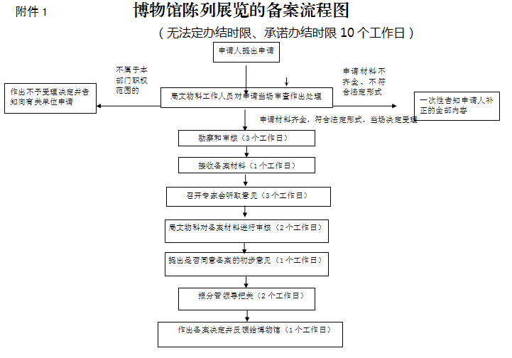 《博物馆条例》(2015年国务院令第659号公布)第三十一条:博物馆举办陈列展览的,应当在陈列展览开始之日10个工作日前,将陈列展览主题、展品说明、讲解词等向陈列展览举办地的文物主管部门或者其他有关部门备案。各级人民政府文物主管部门和博物馆行业组织应当加强对博物馆陈列展览的指导和监督。 |