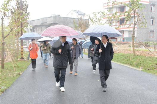 考评验收组实地查看根竹坡生态综合示范村建设情况(右一为组长市农委副主任廖磊,左一为韦新培副区长)