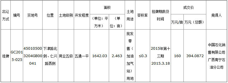 南宁市2015年第十三期国有建设用地使用权公开出让成交公示